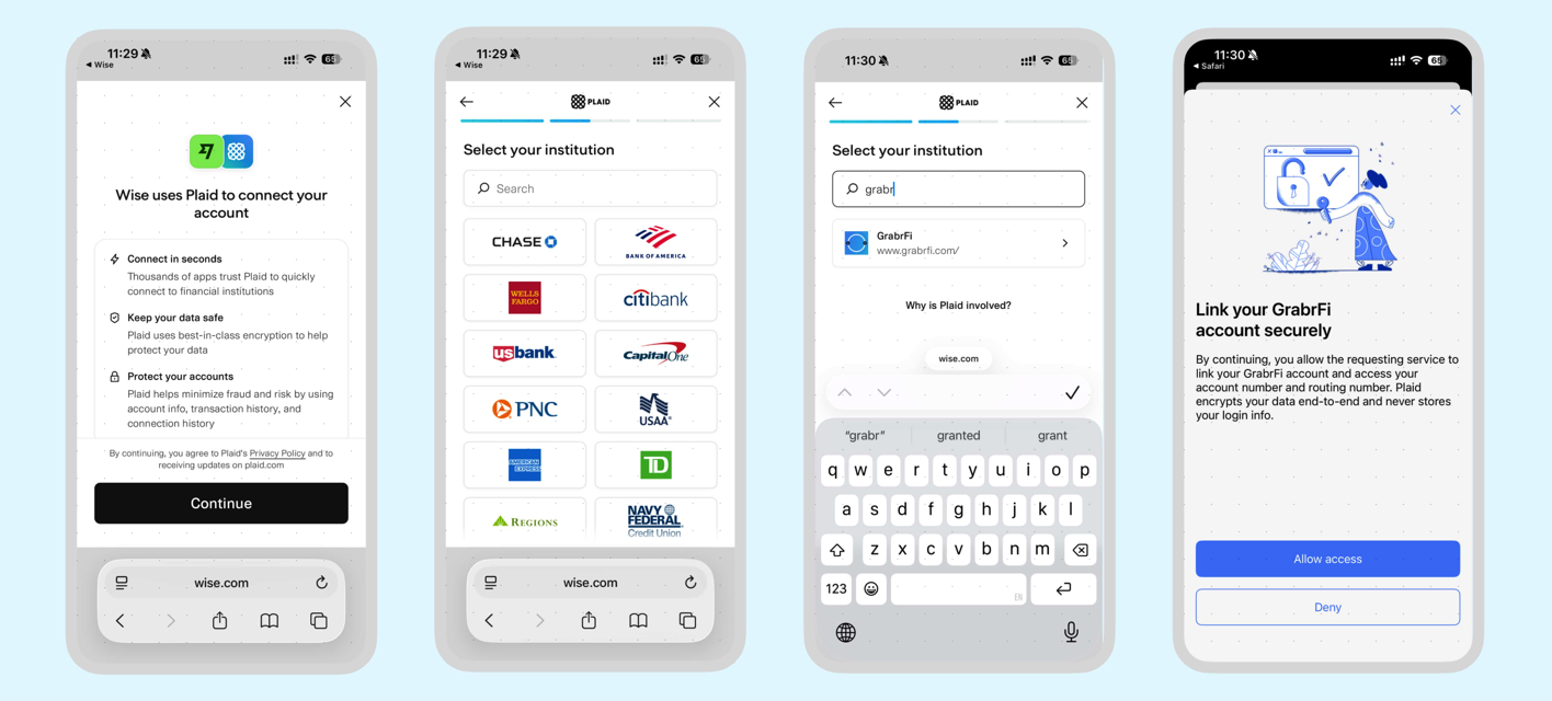 Muchos servicios utilizan Plaid Link para conectar cuentas bancarias. En esas aplicaciones, verás una pantalla que dice “Buscar su banco”. Si ve GrabrFi en la lista, selecciónelo y siga las instrucciones. Plaid es un flujo estándar del sector que utilizan miles de aplicaciones para conectar cuentas de forma segura.