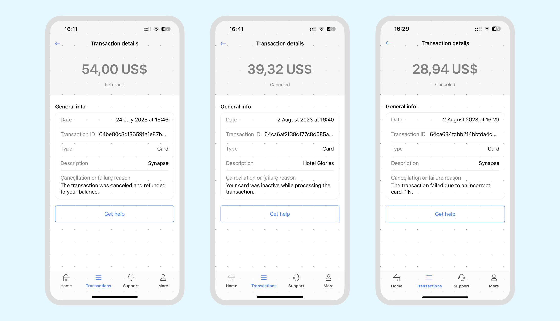 Saldo insuficiente: Ten en cuenta que procesamos todas las transacciones en USD, por lo que si la transacción se realiza en una moneda diferente, debes tener en cuenta las tarifas de cambio de divisas (FX fees). El monto completo de la transacción rechazada/exitosa en USD estará disponible en tus transacciones en nuestra aplicación.