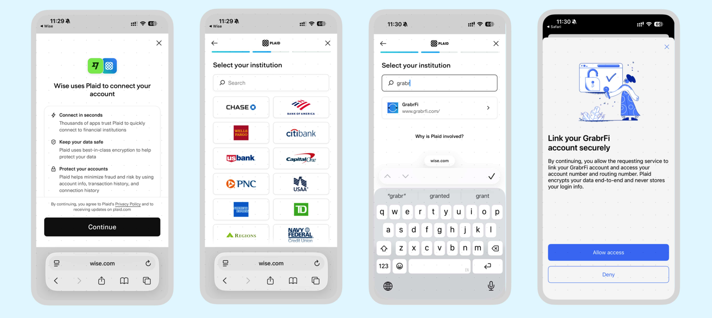 Muitos serviços utilizam o Plaid Link para conectar contas bancárias. Nesses aplicativos, você verá uma tela “Pesquisar seu banco”. Se você encontrar o GrabrFi na lista, selecione-o e siga as instruções. O Plaid é um fluxo padrão do setor utilizado por milhares de aplicativos para conectar contas com segurança.